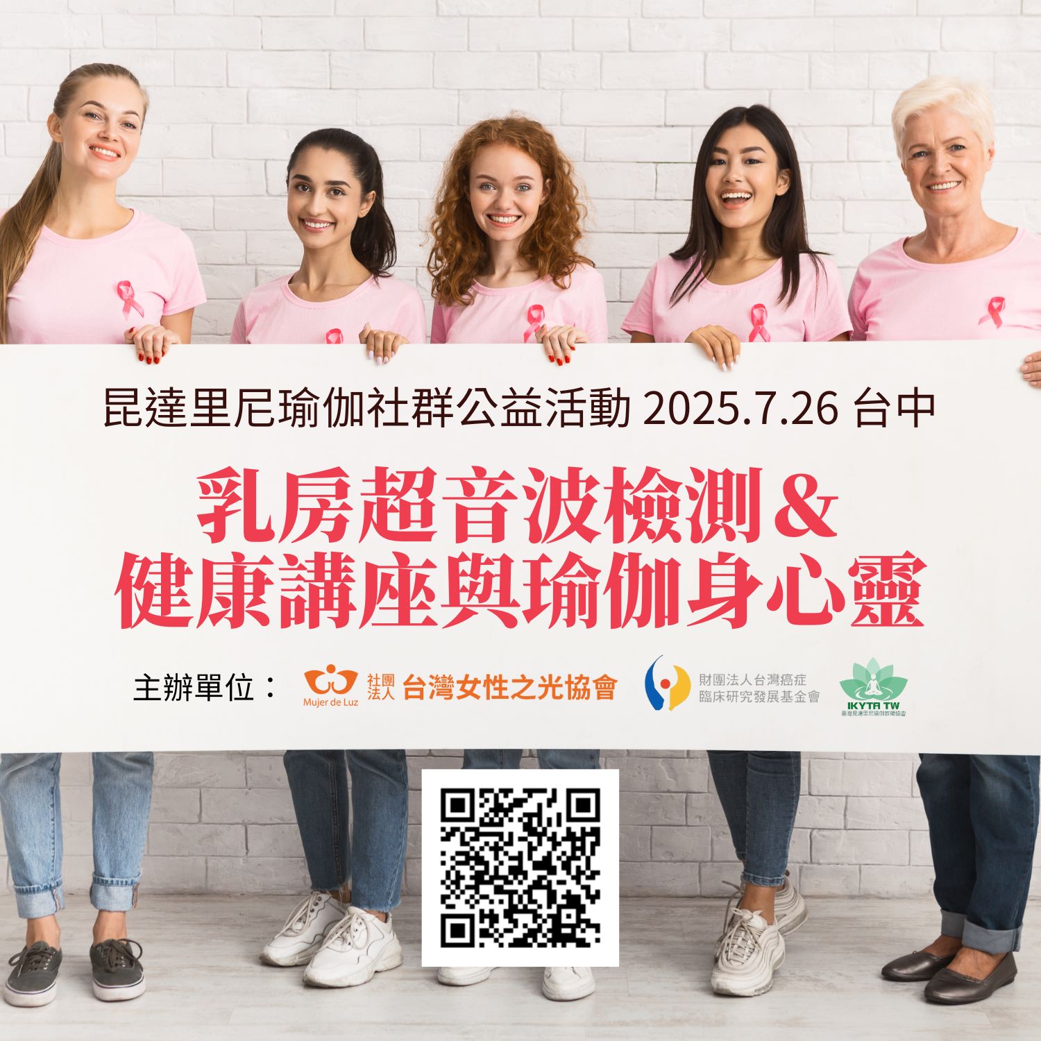 女性關懷日 歷史紀錄: 2025/07/26 乳房超音波檢測&健康講座與瑜伽身心靈(台中) 2025/01/19 乳癌超音波檢測&女人愛自己療癒圈(台北) 2025/01/18 乳癌防治宣導&愛自己呼吸法療癒冥想(台北)