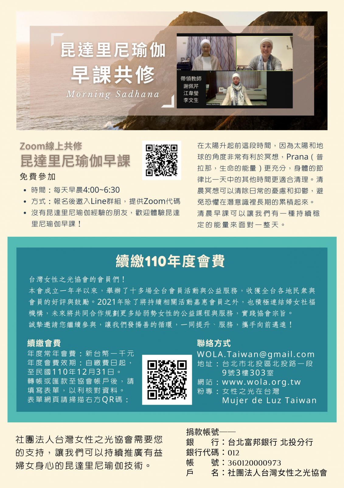 本會為非營利之社會團體,推廣昆達里尼瑜伽技術,給予弱勢、受暴和有需求的婦女,協助其找回自我力量,活出健康、快樂、尊嚴和自信的生活。